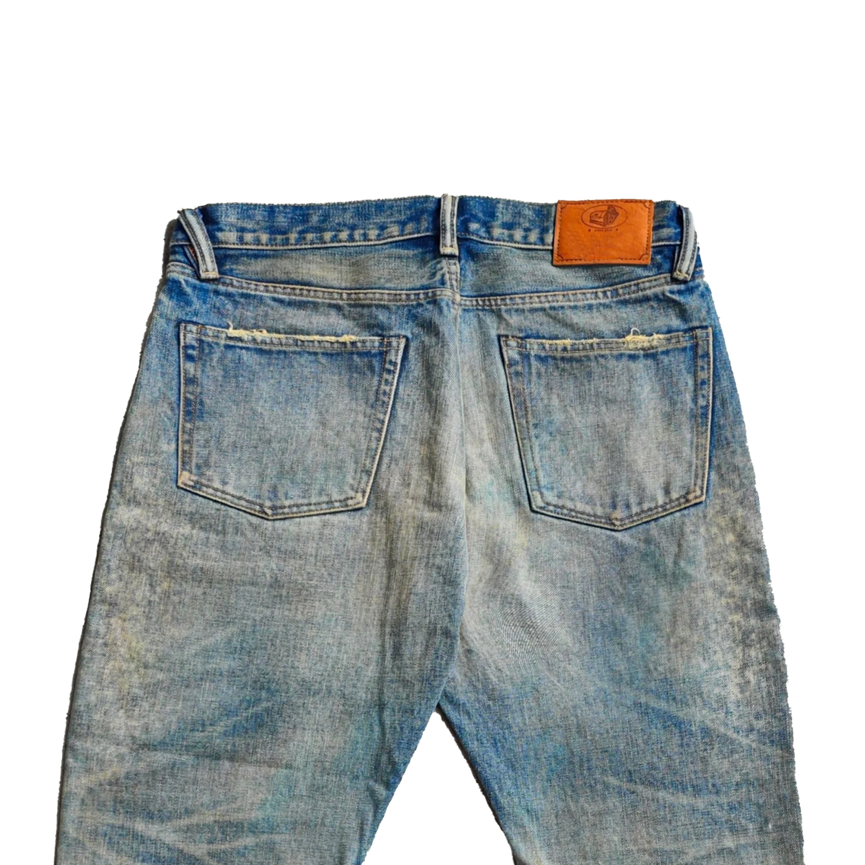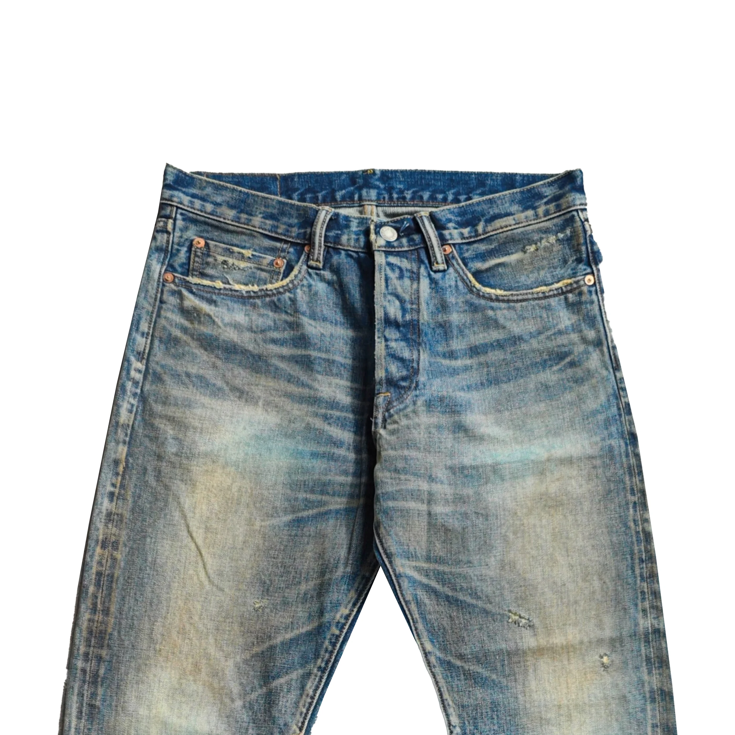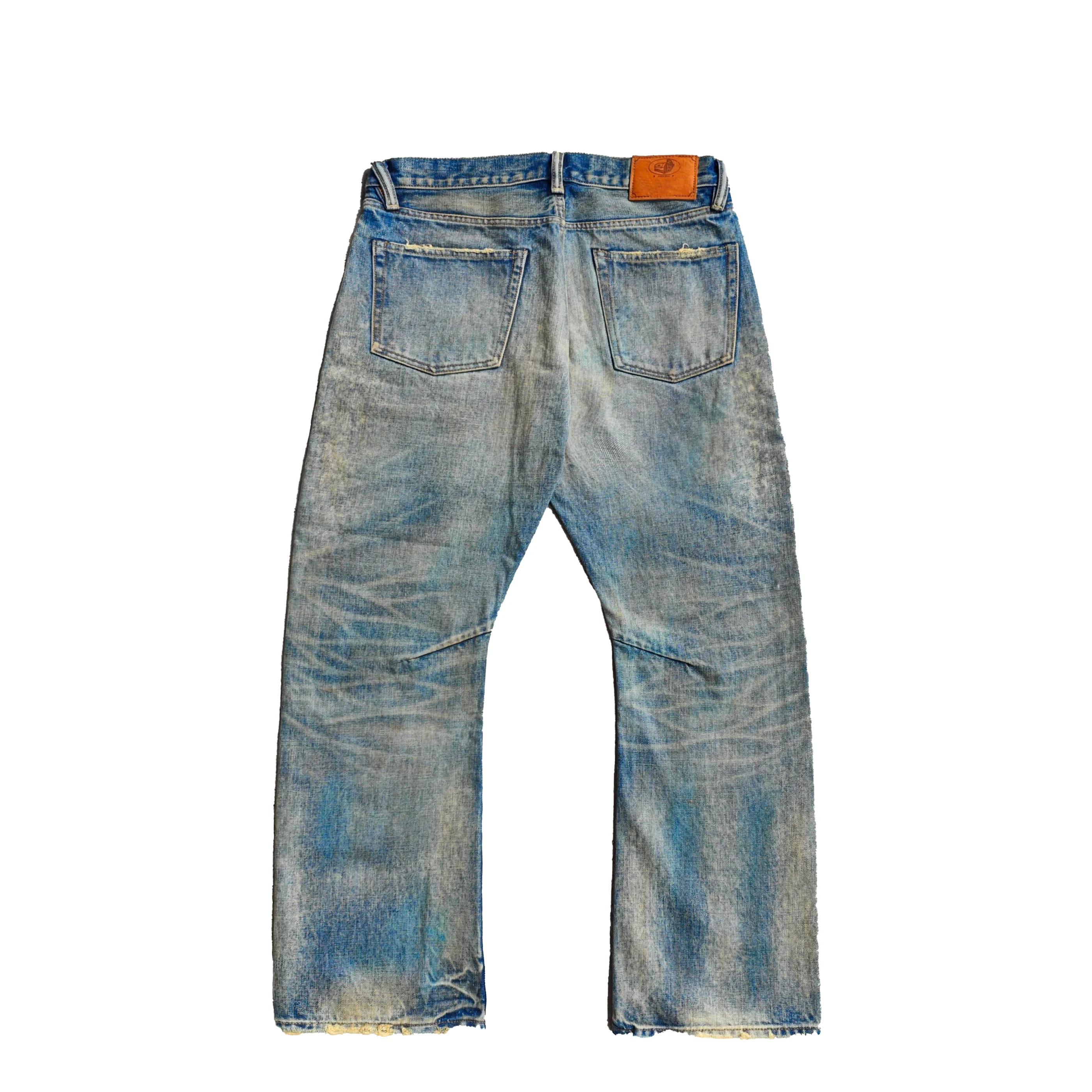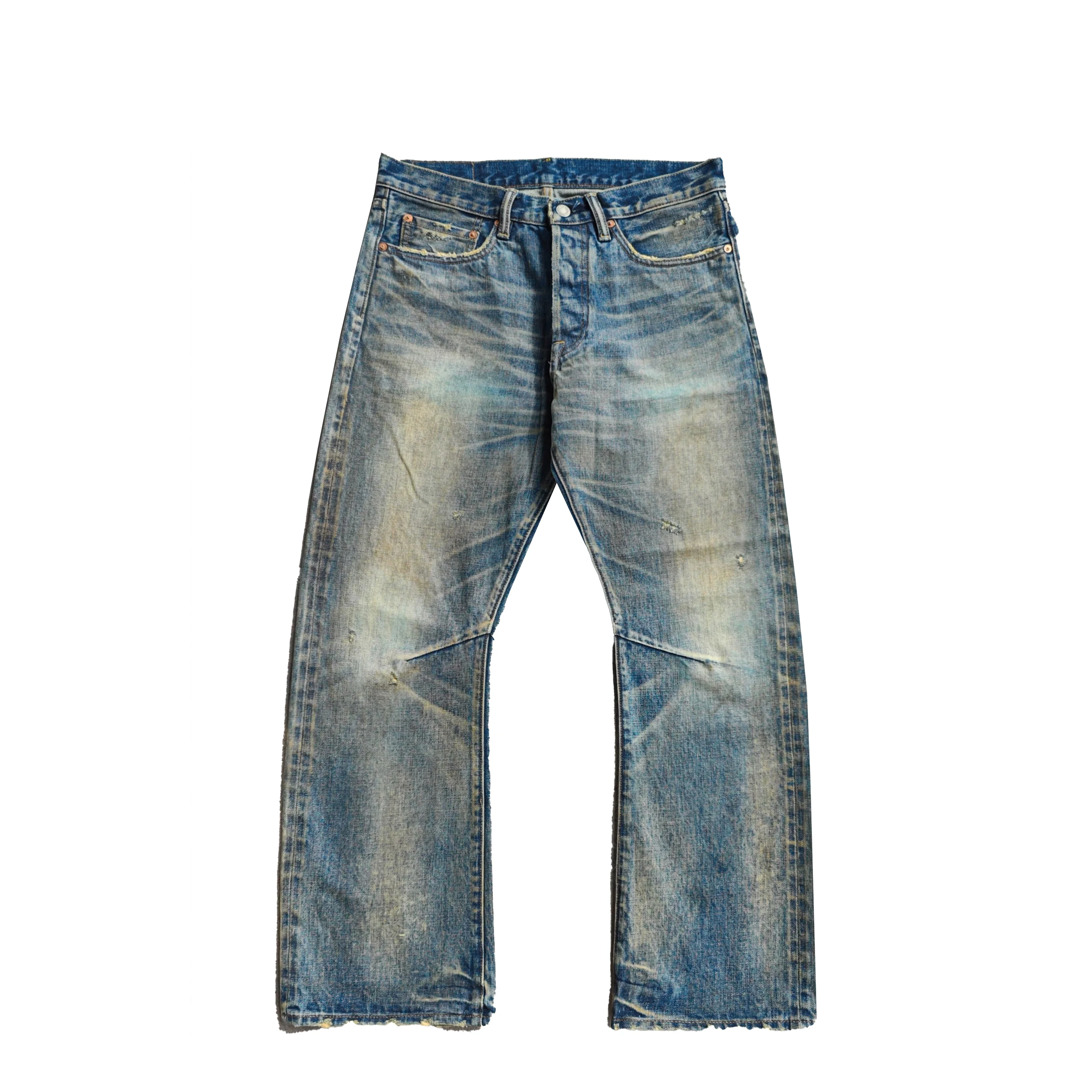 Autumn Vintage Jeans Pants Private Label Boot Cut Style with Mid Waist Baggy Fit Selvedge Denim Button Washed Distressed Print